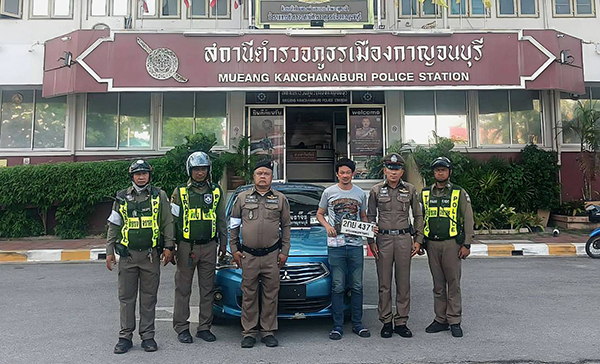 ทำเนียนไม่รอด! – หนุ่มบ่อพลอยขับเก๋งติดป้ายปลอม เข้าด่านจราจร ตร.เมืองกาญจน์จับคาด่าน อ้างไม่รู้ของปลอม ใช้มานาน 5 ปี