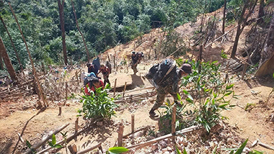 พร้อมตรวจพบกระเป๋าเงินบรรจุบัตรประจำตัวพลเมืองเมียนมาของกลุ่มผู้หลบหนีอีก 5 ราย และยึดของกลางรวม 40 รายการ อาทิ • อุปกรณ์ขุดร่อนทองคำหลายชนิด • ปืนยาวลูกกรดไทยประดิษฐ์ 1 กระบอก พร้อมกระสุน .22 LR จำนวน 10 นัด • โทรศัพท์มือถือ 9 เครื่อง วิทยุสื่อสาร 2 เครื่อง ไฟฉายคาดศีรษะ 11 อัน • เปลนอน 9 ผืน และเงินสกุลจ๊าดจำนวนหนึ่ง