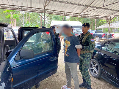 กาญจนบุรี-เมื่อวันที่ 17 พฤศจิกายน 2568 เจ้าหน้าที่ ฉก.ลาดหญ้า กกล.สุรสีห์ สนธิกำลังร่วมฝ่ายความมั่นคงในพื้นที่ ปฏิบัติหน้าที่ ณ จุดตรวจร่วมน้ำเกริ๊ก ม.8 ต.หนองลู อ.สังขละบุรี จ.กาญจนบุรี ตรวจพบชายต้องสงสัยขับรถกระบะผ่านด่าน ลักษณะมีพิรุธ