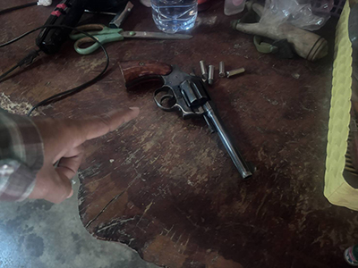 ตำรวจตรวจ ยึดของกลาง ได้แก่ อาวุธปืนลูกโม่ขนาด .38 ยี่ห้อโคลท์ 1 กระบอก ปลอกกระสุนปืนขนาด .38 จำนวน 4 ปลอก กระสุนปืนขนาด .38 บรรจุในตัวปืน 2 นัด