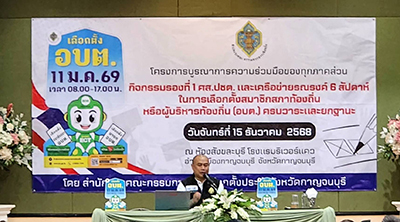 วันที่ 15 ธันวาคม 2568 เวลา09.30 น.ร้อยตำรวจเอกพงศ์บัณฑิต ปิ่นสุวรรณ ผู้อำนวยการสำนักงานคณะกรรมการการเลือกตั้งประจำจังหวัดกาญจนบุรี ได้เดินทางมาเป็นประธานในพิธีเปิดโครงการบูรณาการความร่วมมือของทุกภาคส่วน กิจกรรมรองที่ 1ศส.ปชต. และเครือข่ายรณรงค์ 6 สัปดาห์ในการเลือกตั้งสมาชิกสภาท้องถิ่นหรือผู้บริหารท้องถิ่น (อบต.) ครบวาระและยกฐานะ โดยมี คณะเจ้าหน้าที่ กกต.กาญจนบุรี สื่อมวลชน สมาชิก ศส.ปชต. และเครือข่ายรณรงค์ในการเลือกตั้งสมาชิกสภาท้องถิ่นและผู้บริหารท้องถิ่น (.อบต.)และแขกผู้มีเกียรติที่เดินทางมาร่วมกิจกรรมให้การต้อนรับ ณ โรงแรมริเวอร์แคว ตำบลบ้านเหนือ อำเภอเมือง จังหวัดกาญจนบุรี