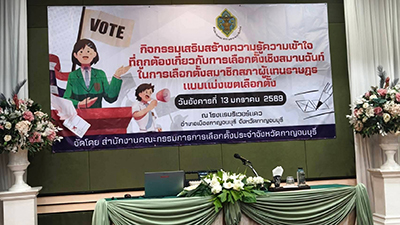 - วันที่[2026-01-13 ] กกต.กาญจนบุรี – ติวเข้มจัดกิจกรรมเสริมสร้างความรู้ความเข้าใจที่ถูกต้องเกี่ยวกับการเลือกตั้งเชิงสมานฉันท์....
