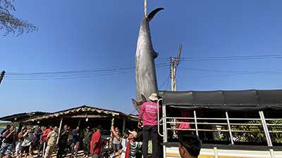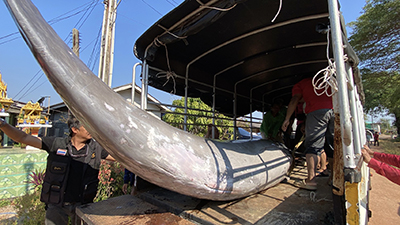 ทั้งนี้ ทางเจ้าหน้าที่ ได้นำรถเครนขนาดใหญ่มายกปลาวาฬขึ้นจากชายฝั่ง เพราะมีน้ำหนักมากเครนคันเล็กไม่สามารถนำ และยกขึ้นได้ จากฝั่ง เพื่อจะนำปลาวาฬขึ้นรถบรรทุกไปยังศูนย์ วิจัยทรัพยากรธรรมชาติทางทะเลและชายฝั่ง อ่าวไทยภาคตะวันออก จังหวัดระยอง เพื่อจะนำไปพิสูจน์ หาสาเหตุกันตายของปลาวาฬหัวขวดนี้ ต่อไป