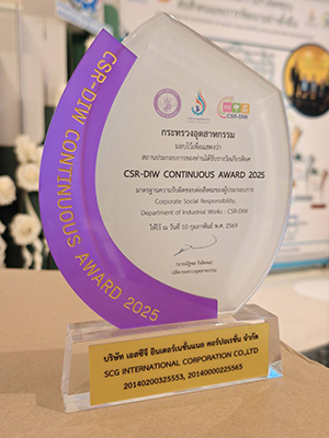 บริษัท เอสซีจี อินเตอร์เนชั่นแนลคอร์ปอเรชั่น จำกัด ตอกย้ำความเป็นผู้นำด้านความรับผิดชอบต่อสังคมอย่างยั่งยืน ด้วยการได้รับรางวัล CSR-DIW Continuous Award ประจำปี 2568 จากกรมโรงงานอุตสาหกรรม กระทรวงอุตสาหกรรม ซึ่งเป็นรางวัลอันทรงเกียรติสำหรับสถานประกอบการที่ดำเนินธุรกิจตามมาตรฐาน CSR-DIW อย่างต่อเนื่องและเป็นรูปธรรม สะท้อนถึงความมุ่งมั่นของบริษัทฯ ในการดำเนินธุรกิจโดยคำนึงถึงผู้มีส่วนได้ส่วนเสียทุกภาคส่วน ทั้งด้านสังคม ชุมชน และสิ่งแวดล้อม และยังคงยึดมั่นในการยกระดับมาตรฐาน ด้านความรับผิดชอบต่อสังคม ให้สอดคล้องกับแนวทางของกรมโรงงานอุตสาหกรรม เพื่อสร้างความเชื่อมั่นและเติบโตเคียงข้างสังคมไทยอย่างยั่งยืน