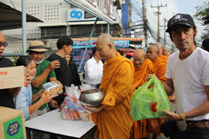 โดยได้รับความเมตตาจากพระภิกษุสงฆ์ วัดสามเรือน จำนวน 9 รูป ได้ออกบิณฑบาตภายในชุมชนเมืองขนาดใหญ่ “หมู่บ้านสินธิวาธานี” ตั้งอยู่ฝั่งตรงข้าม นิคมอุตสาหกรรมโรจนะ เจ้าหน้าที่ อบต.สามเรือน นำเรือท้องแบนขนาดใหญ่ ใส่รถลากตามขบวน พร้อมปิดป้ายประกาศเพื่อระดมความช่วยเหลือ เพื่อรับสิ่งของบริจาคแล้วได้นำใส่เรือ และรถกระบะอีกหลายคัน ซึ่งพ่อค้าแม่ค้าและคนในพื้นที่ นำสิ่งของมาร่วมบริจาคทำบุญจำนวนมาก โดยเฉพาะหนุ่มสาวโรงงาน ซึ่งถึงจะมีรายได้ไม่มาก แต่ร่วมทำบุญบริจาคสิ่งของกันอย่างคับคั่ง จนเป็นที่ชื่นชมของคนทั่วไป