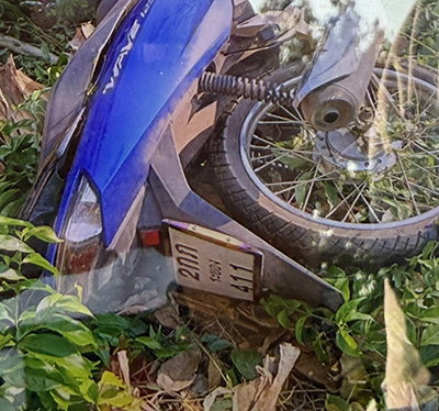 ในที่เกิดเหตุ สภาพเป็น คูข้างทางถนนติดกับสวนทุเรียน ในเขตพื้นที่หมู่ที่ 6 ตำบลช้างข้าม อำเภอนายายอาม จังหวัดจันทบุรี พบรถมอเตอร์ไซค์ฮอนด้าเวฟสีนำเงิน นอนตะแคงอยู่ในคูน้ำข้างทาง ลึกประมาณ2 ถึง 3 เมตร เมื่อตรวจสอบ รถมอเตอร์ไซต์ ซิ่งตรงกับที่ผู้เสียหายได้แจ้งความเอาไว้ ส่วนผู้ต้องหา ที่ได้รับบาดเจ็บ นั้น ทางเจ้าหน้าที่กู้ภัยสว่างกตัญญูได้นำตัวขึ้นมาปฐมพยาบาลและนำขึ้นเปลผูกมัดไว้