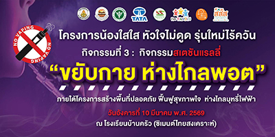 - วันที่[2026-03-12 ] สระบุรี –ร.ร.บ้านครัว (ซิเมนต์ไทยสงเคราะห์) บูรณาการ “กิจกรรมสเตชันแรลลี่ ขยับกาย ห่างไกลพอต” โทษพิษภัยของบุหรี่ไฟฟ้า....