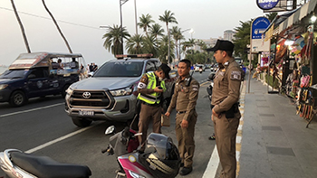 มีรายงานว่า พ.ต.ท.ภาณุพงศ์ นิ่มสุวรรณ์ สว.จร.สภ.เมืองพัทยา พร้อมกำลังเจ้าหน้าที่ตำรวจจราจร ลงพื้นที่กวดขันวินัยการจราจรถนนเลียบชายหาดพัทยา จ.ชลบุรี ในการเป็นเจ้าบ้านที่ดีพร้อมต้อนรับนักท่องเที่ยว