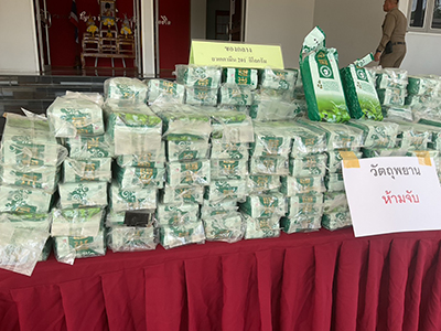 - วันที่[2025-10-01 ] กาญจนบุรี - แถลงผลจับกุมเครือข่ายยาเสพติดรายใหญ่ ยึดเคตามีน 201 กก. ไอซ์ 25 กก. และยาบ้า 20,000 เม็ด รวมมูลค่ากว่า 60 ล้าน....