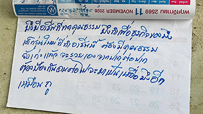 - วันที่[2026-01-07 ] กาญจนบุรี – เพื่อนบ้านผงะ! พบลุงวัย 69 แขวนคอหน้าบ้าน ทิ้งจดหมายตัดพ้อ หนีโรครุมเร้า....