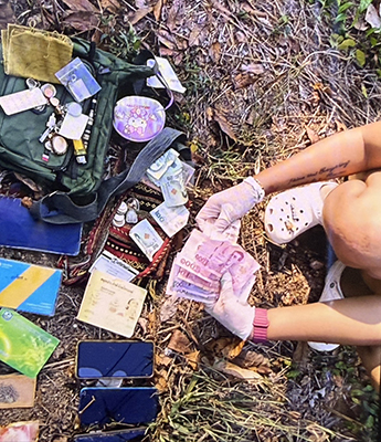 ตนจึงแน่ใจว่าถูกขโมยกระเป๋าไป จึงออกวิ่งตาม พร้อมรองตะโกน ให้โจรหยุด แต่ตามไม่ทัน จึงแจ้งกับน้าเจ้าของบ้าน บอกกับแฟนที่ทำงานอยู่ในสวนทุเรียน โทรแจ้งตำรวจ และอีกหลาย ชั่วโมงจึง ได้รับแจ้งจากตำรวจ ว่าเจอคนร้ายที่ขโมยทรัพย์สินแล้ว จึงขอตนไปในที่เกิดเหตุ ว่าใช้ของที่ถูกขโมยมาหรือไม่ ซึ่งตนเองตรวจดู ทรัพย์สินต่างๆอยู่ครบ และยืนยันว่าเป็นของตน ยังบอกด้วยว่า เวรกรรมตามทัน และดีใจที่ได้ของคืนกลับมา ซึ่งตนก็คิดว่าจะไม่ได้คืนแล้ว ตนเองก็พึ่งมาอยู่ในพื้นที่ เปิดรับจ้างทำสวน ได้เพียง 15 วัน ก็มาโดนก่อเหตุดังกล่าว
