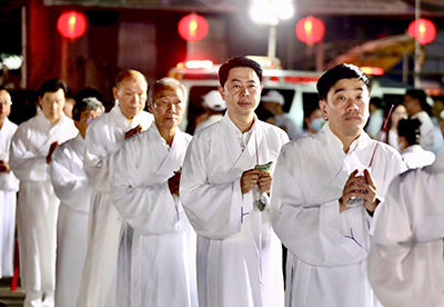 สำหรับพิธีสวดมนต์สะเดาะเคราะห์ต่ออายุ (วันไป๊เต๊า) วันเดินธูปใหญ่ ในเทศกาลกินเจนั้น ตามความเชื่อของชาวจีนและชาวไทยเชื้อสายจีน เชื่อกันว่าเป็นพิธีศักดิ์สิทธิ์ เป็นการสรรเสริญและรับพรจากเทพเจ้า 9 พระองค์ อันเป็นภาคหนึ่งของพระพุทธเจ้า 7 พระองค์ และพระโพธิสัตว์ 2 พระองค์ โดยเชื่อว่าเมื่อรับพรจากเทพเจ้าแล้ว จะทำให้จิตใจเบิกบานผ่องแผ้ว มีแต่ความสุข ความเจริญ และเป็นสิริมงคล ซึ่งประชาชนผู้ถือศีลกินเจจะนุ่งขาว ห่มขาวมาร่วมพิธีเป็นจำนวนมากในทุกๆ ปี