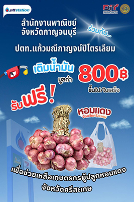 สำนักงานพาณิชย์จังหวัดกาญจนบุรี ร่วมกับ สถานีบริการ ปตท.คีรีทองคำ และสถานีบริการ ปตท.แก้วมณีกาญจน์ปิโตรเลียม จัดกิจกรรมช่วยเหลือเกษตรกรผู้ปลูกหอมแดงจังหวัดศรีสะเกษ ด้วยการนำหอมแดงคุณภาพ ซึ่งเป็นสินค้า GI ของจังหวัดศรีสะเกษ มาแจกให้แก่ประชาชนที่มาใช้บริการเติมน้ำมัน