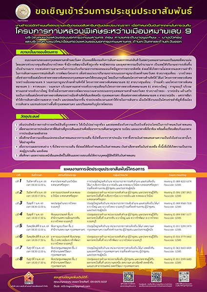 จึงขอเรียนเชิญผู้สนใจเข้าร่วมการประชุมฯ ในวัน และเวลาดังกล่าว เพื่อเป็นการประชาสัมพันธ์การดำเนินงานโครงการให้ทุกภาคส่วน ได้เข้ามามีส่วนร่วมในการแสดงความคิดเห็น โดยสามารถติดต่อสอบถาม และแจ้งลงทะเบียนเข้าร่วมประชุมได้ทางไลน์โครงการ โดยการเพิ่มเพื่อนทางบัญชีไลน์โครงการ ชื่อ เวนคืน M9 (@717jmvcs) หรือติดต่อสอบถามได้ที่ - คุณเบญจววรณ จรรยา โทรศัพท์ 09 0975 5037 และ 0 2885 2173