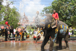 เวลา 10.00 น. วันที่ 11.เม.ย.60 นายอิทธิพันธ์ ขาวละมัย ผู้จัดการ วังช้างอยุธยา แล เพนียด นำช้างแสนรู้ จำนวน 11 เชือก เพ้นท์ด้วยสีน้ำลายเส้น และลายดอกไม้ สีสัน สดใส สวยงาม เขียนข้อความทั้งภาษาไทยและอังกฤษ สงกรานต์อยุธยาปี 60 โดยมีนักท่องเที่ยวทั้งชาวไทย และต่างประเทศ ร่วมกันสาดน้ำเล่นน้ำสงกรานต์กันอย่างสนุกสนาน ภายในอุทยานประวัติศาสตร์พระนครศรีอยุธยา เป็นการประเดิมรับเทศกาลสงกรานต์อยุธยามหามงคล ปีใหม่ไทย เพื่อเป็นการเชิญชวนนักท่องเที่ยวมาร่วมเล่นน้ำสงกรานต์แบบวิถีไทย แต่งกายด้วยชุดไทยร่วมสมัย เล่นน้ำสงกรานต์กับช้างที่จังหวัดพระนครศรีอยุธยา ณ บริเวณด้านหน้าอาคารเรือนไทย การท่องเที่ยวแห่งประเทศไทย (ททท.) สำนักงานพระนครศรีอยุธยา ถนนศรีสรรเพชญ์ อ.พระนครศรีอยุธยา จ.พระนครศรีอยุธยา