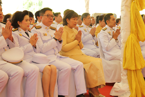 จากนั้นในเวลา 09.00 น. นายภานุ แย้มศรี นำทุกภาคส่วน พร้อมใจกันประกอบพิธีวางพวงมาลาและถวายบังคม เบื้องหน้าพระบรมฉายาลักษณ์ พระบาทสมเด็จพระบรมชนกาธิเบศร มหาภูมิพลอดุลยเดชมหาราช บรมนาถบพิตร รัชกาลที่ 9 เพื่อน้อมรำลึกในพระมหากรุณาธิคุณและเป็นการเฉลิมพระเกียรติพระองค์ท่าน ที่ทรงทุ่มเทพระราชฤทัยและพระวรกายปฏิบัติพระราชกรณียกิจเป็นอเนกประการเพื่อพสกนิกรชาวไทย ทั้งยังทรงเป็นต้นแบบในการคิด สร้างสรรค์ ทำนุบำรุง อนุรักษ์ สืบสาน และพัฒนาประเทศชาติ ตลอดระยะเวลา 70 ปี แห่งการครองสิริราชสมบัติ โดยทรงมีโครงการในพระราชดำริ พระราชดำรัสอย่างมากมายเพื่อให้พสกนิกรทุกหมู่เหล่าได้น้อมนำไปประพฤติปฏิบัติใช้ในชีวิตประจำวัน