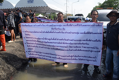 โดยมีข้อเรียกร้อง คือ 1. ขอให้ชลประทานไม่ระบายน้ำเข้าเพิ่มในพื้นที่ ต.หัวเวียง ต.บ้านกระทุ่ม และพื้นที่ที่ได้รับผลกระทบใกล้เคียง 2.ให้ชลประทาน บริหารจัดการน้ำที่ท่วมสูงในพื้นที่ ต.หัวเวียง ต.บ้านกระทุ่ม และพื้นที่ตำบลที่ได้รับผลกระทบใกล้เคียงให้ลดลงเร็วที่สุดโดยชลประทานมีหน้าที่บริหารจัดการตามข้อเรียกร้อง 3.ให้ชลประทาน ชี้แจงและแจ้งถึงการบริหารจัดการการระบายน้ำ ให้ความชัดเจน ว่าสถานการณ์น้ำในพื้นที่ ต.หัวเวียง ต.บ้านกระทุ่ม และพื้นที่ที่ได้รับผลกระทบในตำบลใกล้เคียงจะลดเข้าสู้ภาวะปกติ เมื่อไหร่ 4.หลังจากน้ำลดเข้าสู้สภาวะปกติแล้วให้ชลประทาน วางแผนร่วมกับผู้เกี่ยวข้องในการบริหารจัดการน้ำในพื้นที่ ต.หัวเวียง ต.บ้านกระทุ่ม และตำบลที่ได้รับผลกระทบใกล้เคียง ให้ได้รับการระบายน้ำอย่างเป็นธรรมในปีต่อๆไปด้วยความจริงจัง