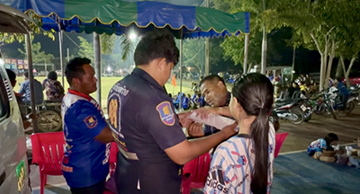 มีกองเชียร์ได้หกล้ม เกิดจากการเจ็บที่แขนขวา ด้วยทางผู้จัด การแข่งขันฟุตบอล มีการเตรียมความพร้อม ในความปลอดภัยขั้นสูง ขณะนั้นได้มีหน่วยกู้ภัยสว่างกตัญญู จุดช้างข้าม ได้รี่เข้าไปนำตัวไป ผู้ได้รับบาดเจ็บ ด้วยการประถมพยาบาลเบื้องต้น บริเวณแขนข้างขวา ซึ่งก็สร้างความตกใจให้กับกองเชียร์ ในการแข่งขันในครั้งนี้ ดีที่ได้มีการวางแผนการวางตัวหน่วยกู้ชีพกู้ภัย หน่วยปฐมพยาบาลไว้เป็นอย่างดี